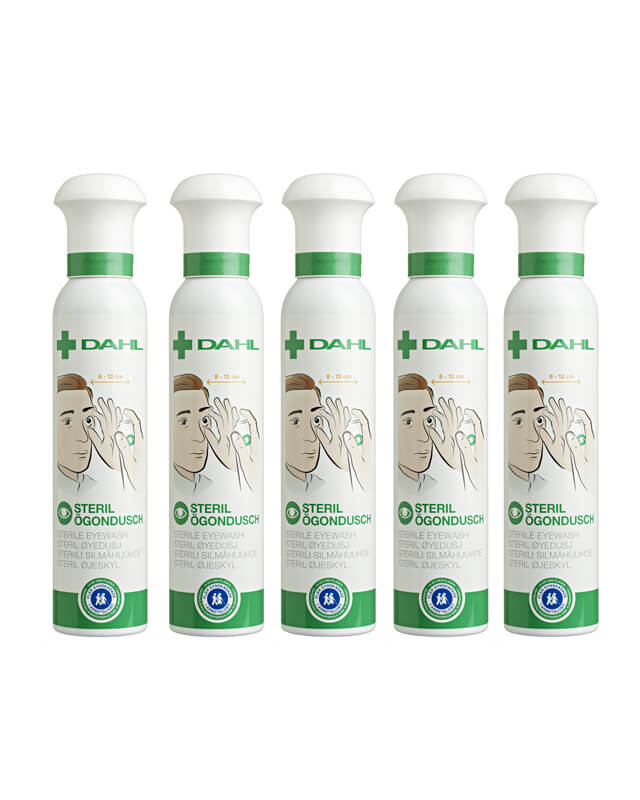 5 st utbytesflaskor för Ögonduschställning som sitter fast med korken i ställningen vilket gör att ett enda moment krävs för få en spolklar flaska i handen. Perfekt när ögonspolning måste inledas omedelbart. Flaskorna innehåller steril buffrad koksaltlösning och spoltiden för varje flaska är minst 6 minuter.