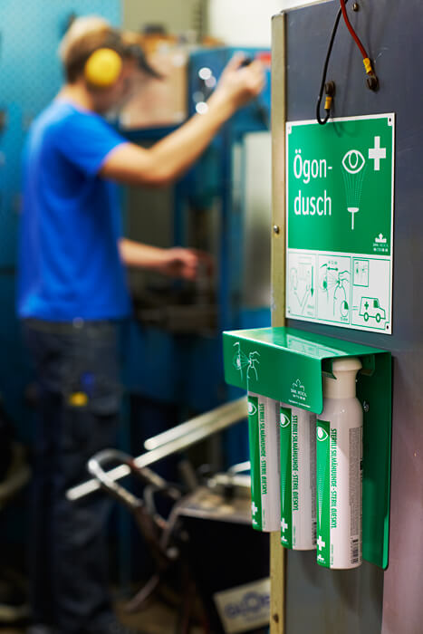 Med denna unika mönsterskyddade väggställningar för Ögondusch 200 ml får du en överskådlig och lättillgänglig ögonduschstation. Flaskorna sitter fast med korken i ställningen vilket gör att ett enda moment krävs för få en spolklar flaska i handen. Perfekt när ögonspolning måste inledas omedelbart.