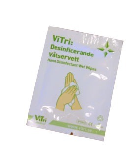 10 stycken Desinficerande våtservetter enskilt förpackade i förpackning med non-woven duk bestående av 35% etanol, 35% isopropanol, 0,5 & glycerin, vatten.