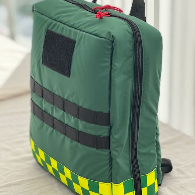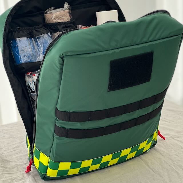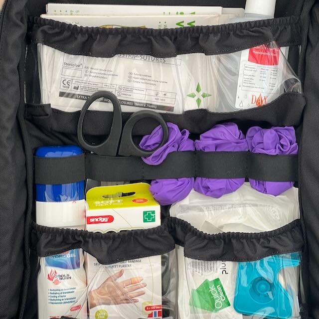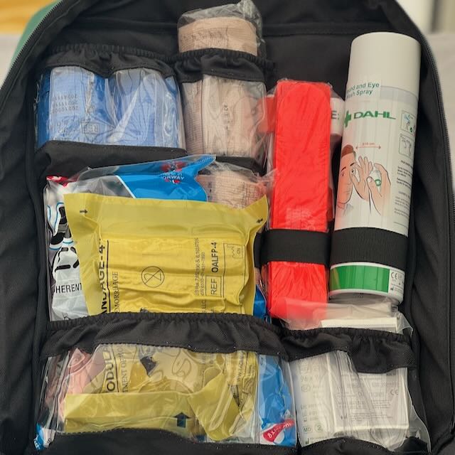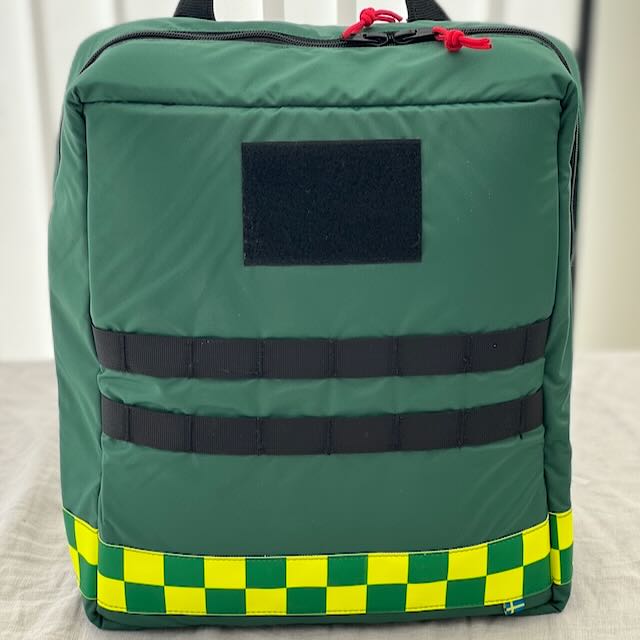 Första hjälpen-väska fylld med material för att hantera allt från småsår till livshotande blödningar. Jämfört med med vanliga förbandstavlor så innehåller denna väska betydligt mer kraftfulla och effektiva förband.