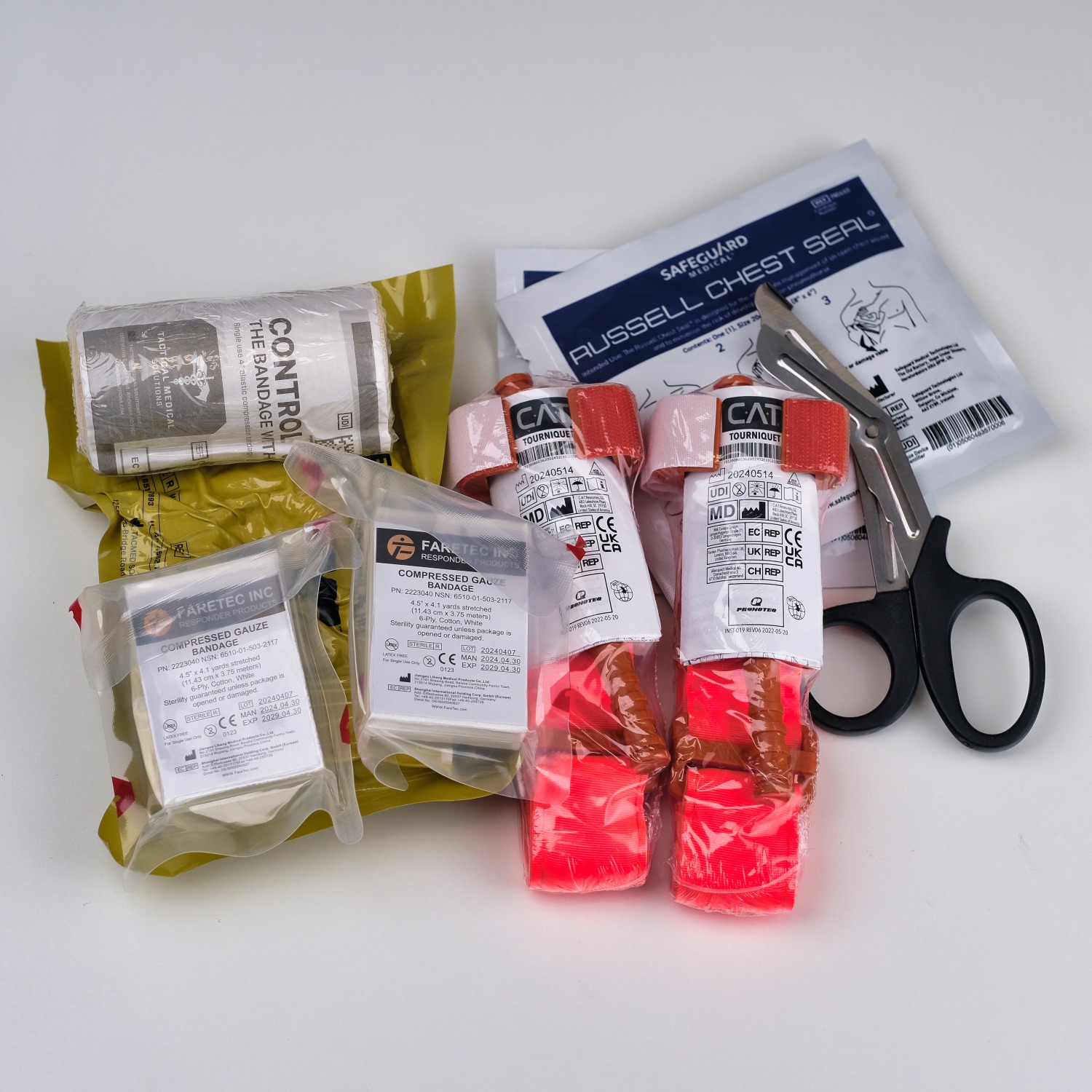 - 2 st H-Vent Chest Seals – För omedelbar behandling av penetrerande bröstskador, som skottskador, vilket förhindrar tryckpneumotorax.