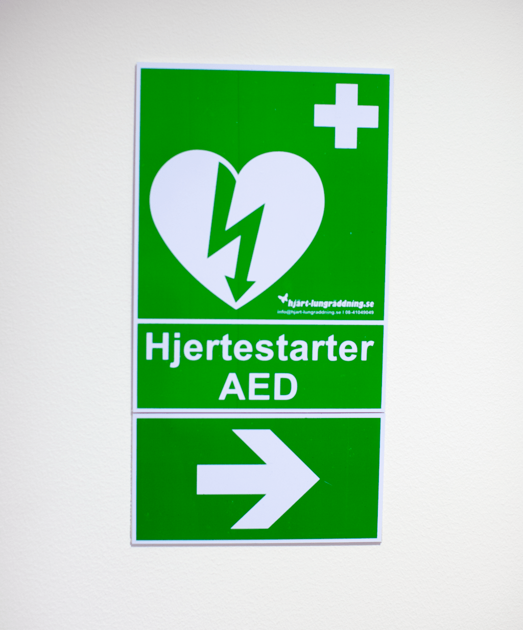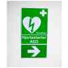 Riktningsvisande pil, visar i vilken riktning hjärtstartaren sitter uppsatt. självhäftande baksida, lätt att montera. Vänds för att peka åt höger eller vänster.