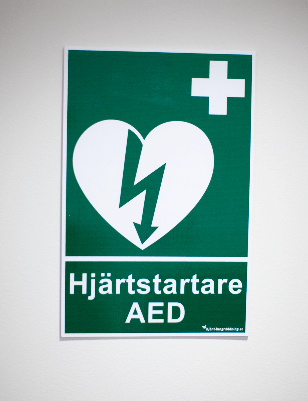 Stor skylt, monteras ovanför hjärtstartaren. Sätts upp med dubbelhäftande montagetejp.